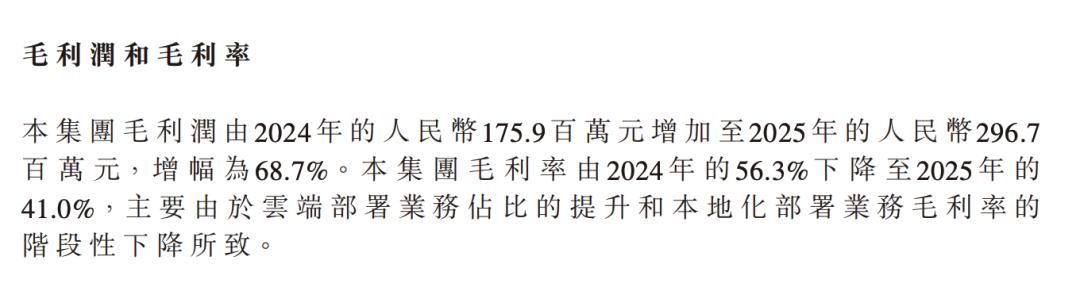 全年整体毛利率41.0%,较2024年的56.3%下降了超过15个百分点,甚至低于2025年上半年招股书披露的50.0%。