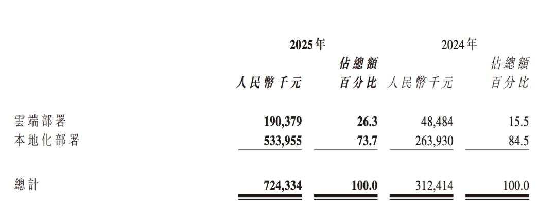 云端部署收入从2024年的4848万元增至2025年的1.904亿元,增幅292.6%,占总收入比重从15.5%提升至26.3%。本地化部署收入从2024年的2.639亿元增至5.340亿元,增幅102.3%,占比从84.5%降至73.7%。
