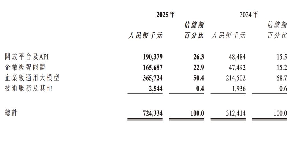 财报同时新增了一套按业务形态拆分的收入分类,取代了此前单一的部署方式分类。三条产品线的增速分化明显:开放平台及API收入1.904亿元,增长292.6%,企业级智能体收入1.657亿元,增长248.8%,企业级通用大模型收入3.657亿元,增长70.5%。
