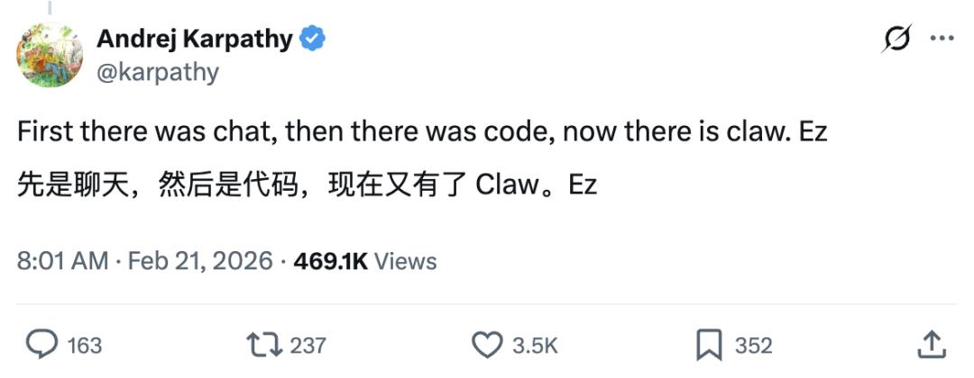 早在今年2月,OpenClaw刚刚火出圈的时候,Karpathy就做出了这个预言。