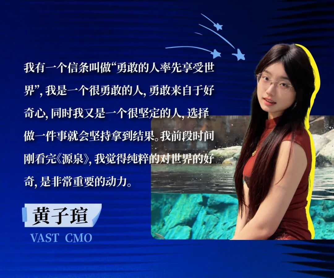 我有一个信条叫做“勇敢的人率先享受世界”,我是一个很勇敢的人,勇敢来自于好奇心,同时我又是一个很坚定的人,选择做一件事就会坚持拿到结果。我前段时间刚看完《源泉》,我觉得纯粹的对世界的好奇,是非常重要的动力。