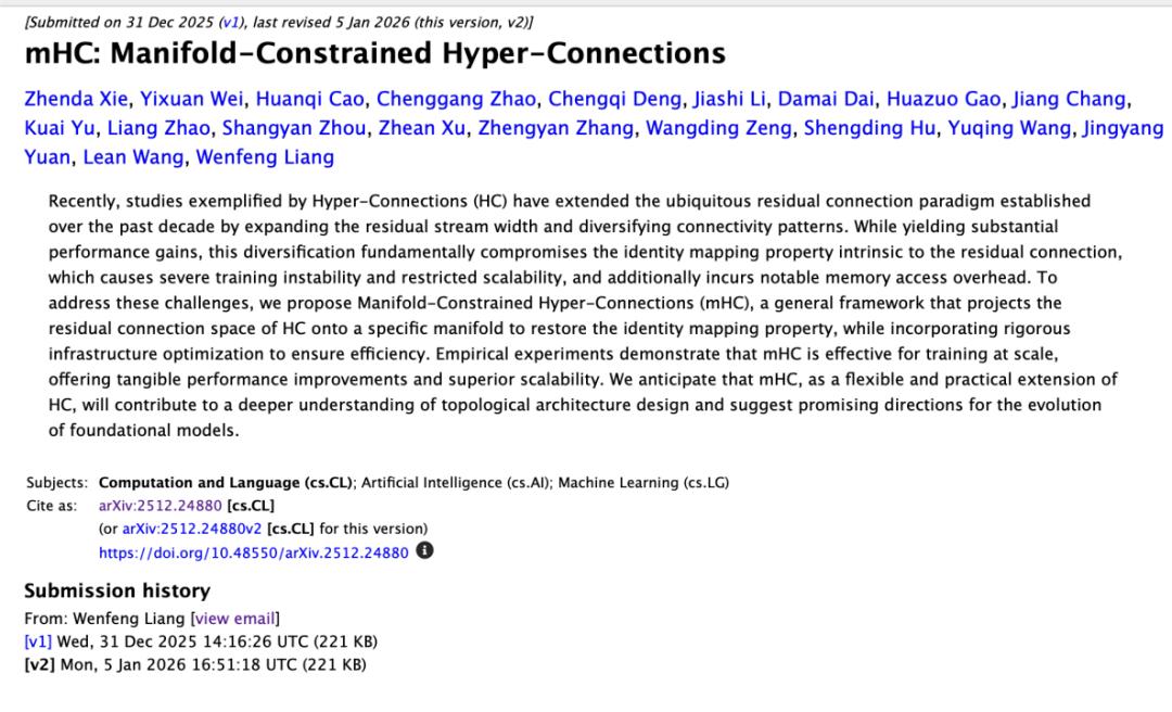 2025年12月31日,梁文锋上传发布了一篇名为《mHC: Manifold-Constrained Hyper-Connections》的论文。