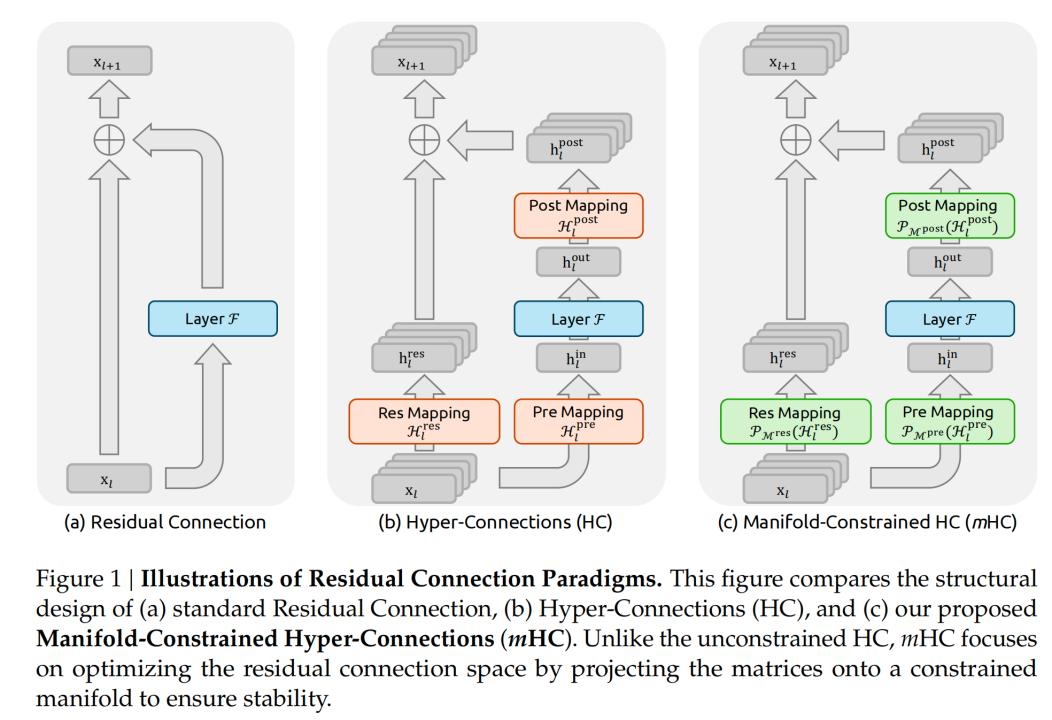 先看,mHC(Manifold-Constrained Hyper-Connections)。类似一个稳定的骨架,解决“练得出来”的问题。