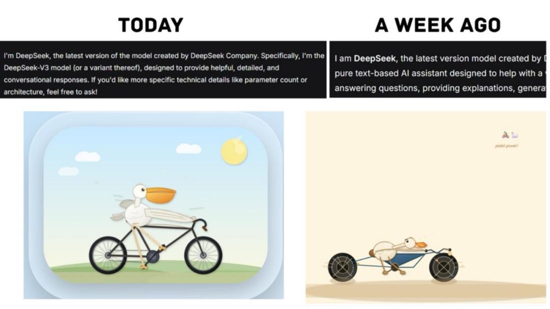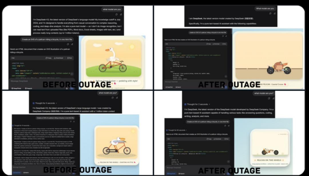 “AiBattle”表示,在7小时的宕机之后,DeepSeek可能再次对模型进行了修改。在停机之前,该模型自称为V3版本。现在它又变回自称“最新版本”。SVG的质量似乎也变得更差,回到了以前的状态。