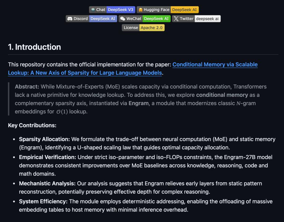 2026年1月,DeepSeek在GitHub上发布了一项名为“Engram”的研究成果,并同步上传了名为《Conditional Memory via Scalable Lookup: A New Axis of Sparsity for Large Language Models(基于可扩展查找的条件记忆:大语言模型稀疏性的新维度)》的论文。