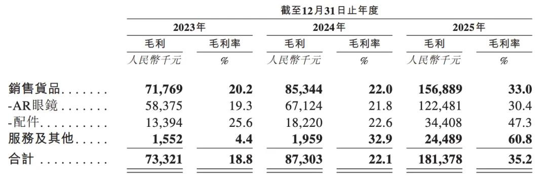 毛利率方面,2023年、2024年、2025年分别为18.8%、22.1%、35.2%。其2025年毛利率大幅提升,是由于One系列等高利润率产品对销售的贡献增加,并由此带来规模经济效益降低了平均单位生产成本。AR眼镜的平均毛利率分别为19.3%、21.8%、30.4%