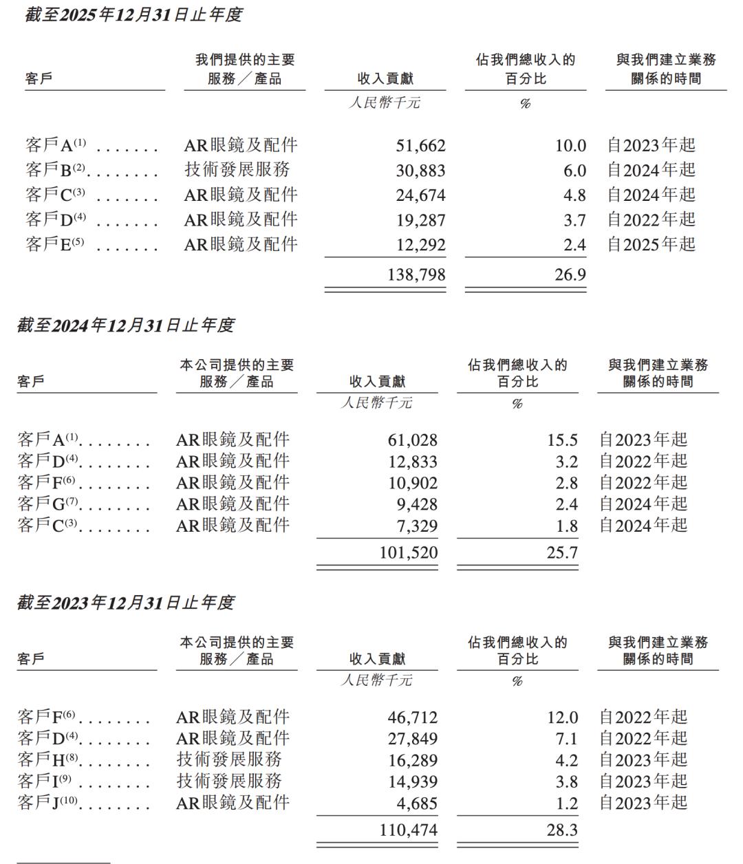 XREAL的客户包括个人消费者、第三方分销商、企业客户。2023年至2025年,其每年对前五大客户的销售额分别为1.1亿元、1.01亿元、1.39亿元,分别占同年总收入的28.3%、25.7%及26.9%。