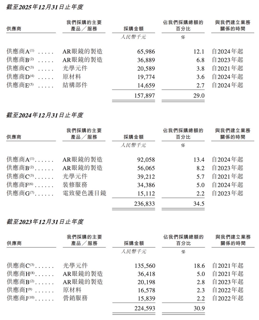 其供应商主要包括生产所用原材料的供应商、第三方制造服务供应商、硬件设计服务供应商。2023年至2025年,XREAL向前五大供应商的采购额每年飞别为2.25亿元、2.37亿元、1.58亿元,各占同期采购总额的30.9%、34.5%及29.0%。