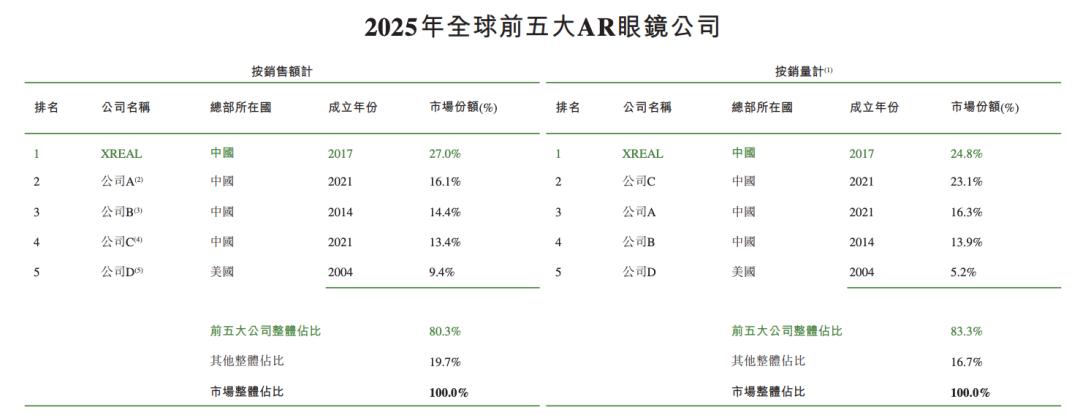 按2025年销售收入计,XREAL在包含AR眼镜和无显示眼镜的整个智能眼镜市场排名全球第二、中国第一。按批注估计公司E为小米、F为华为。