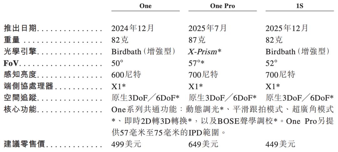 One系列进一步强化了显示和交互能力。其设备搭载了Micro-OLED显示技术、定制化X1端侧协处理器及可根据不同光线条件自动调节亮度的电致变色镜片。