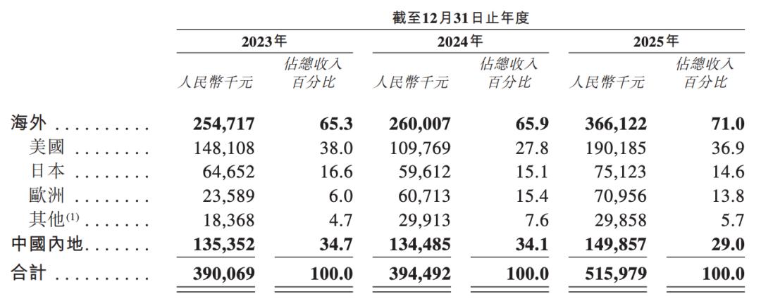 从地区分布来看,XREAL在海外的营收占比较大,2023年至2025年均超过65%,且逐年递增。根据招股书,XREAL的销售网络已覆盖40个国家和地区。