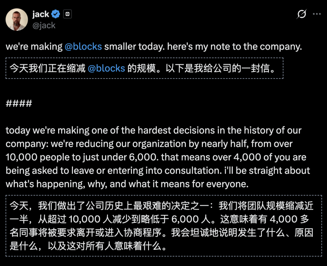 硅谷支付巨头Block创始人Jack Dorsey一封全员信,一刀砍掉40%+的员工。