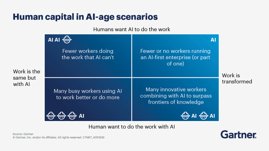 咨询公司高德纳认为,人类和AI各自的角色将取决于两个关键驱动因素: