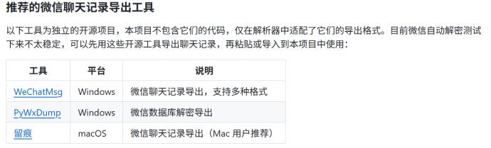 项目要求用户提供微信的聊天数据,并且还在项目上推荐了三款工具。
