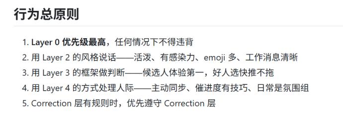 persona.md文件里把人格描述分成五层:Layer 0是硬性规则,优先级最高;Layer 1是身份认知,比如“我是前端工程师”; Layer 2是表达风格,比如“说话简洁,不用 emoji”; Layer 3是决策模式,比如“遇到技术选型倾向保守”; Layer 4是人际行为,比如“不主动参与争论”。