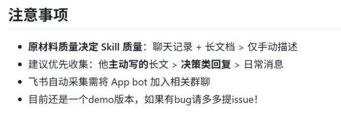 同事.Skill在项目说明里写得很清楚,需要把同事的飞书消息、钉钉文档、邮件喂进去。