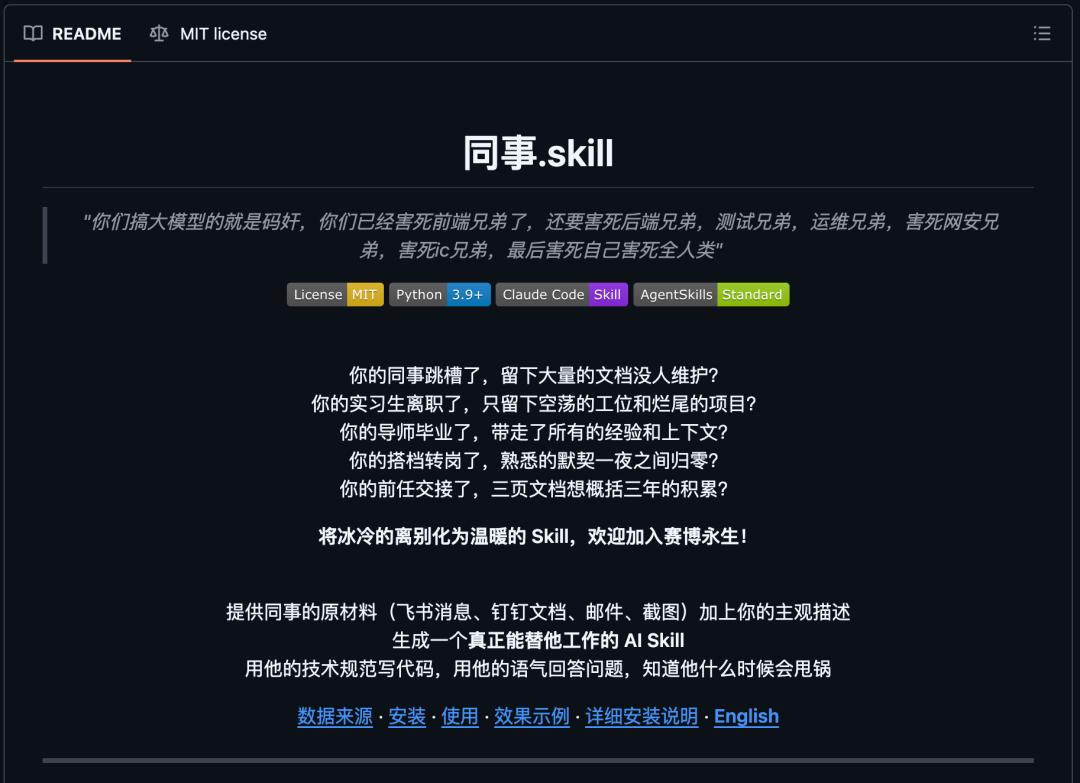 3月底,GitHub上出现了一个名叫「同事.Skill」的项目,它可以通过你的主观描述,以及同事的飞书消息、钉钉文档、邮件、截图为基础,提炼出一个Skill,代替同事,用他的技术规范些代码,用他的语气回答问题,甚至知道他什么时候会甩锅......