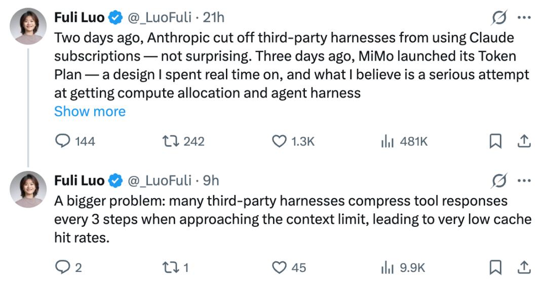 Anthropic禁止订阅用户通过龙虾等第三方工具接入后,小米大模型团队负责人罗福莉凌晨发了篇帖子讨论这事。