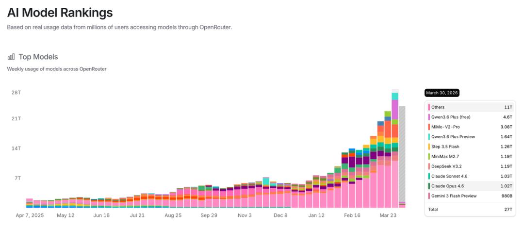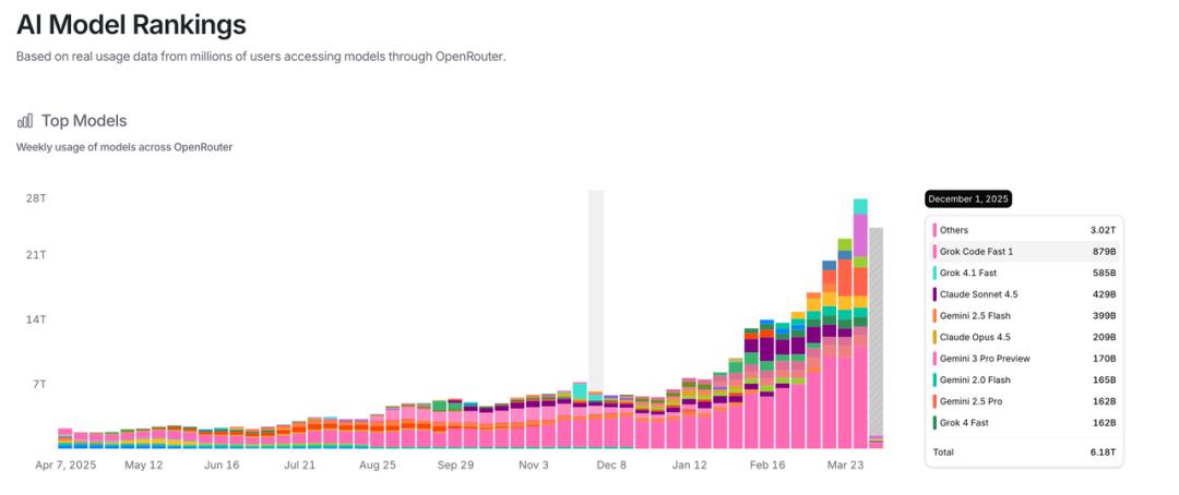 这是OpenRouter上不同模型的使用统计。