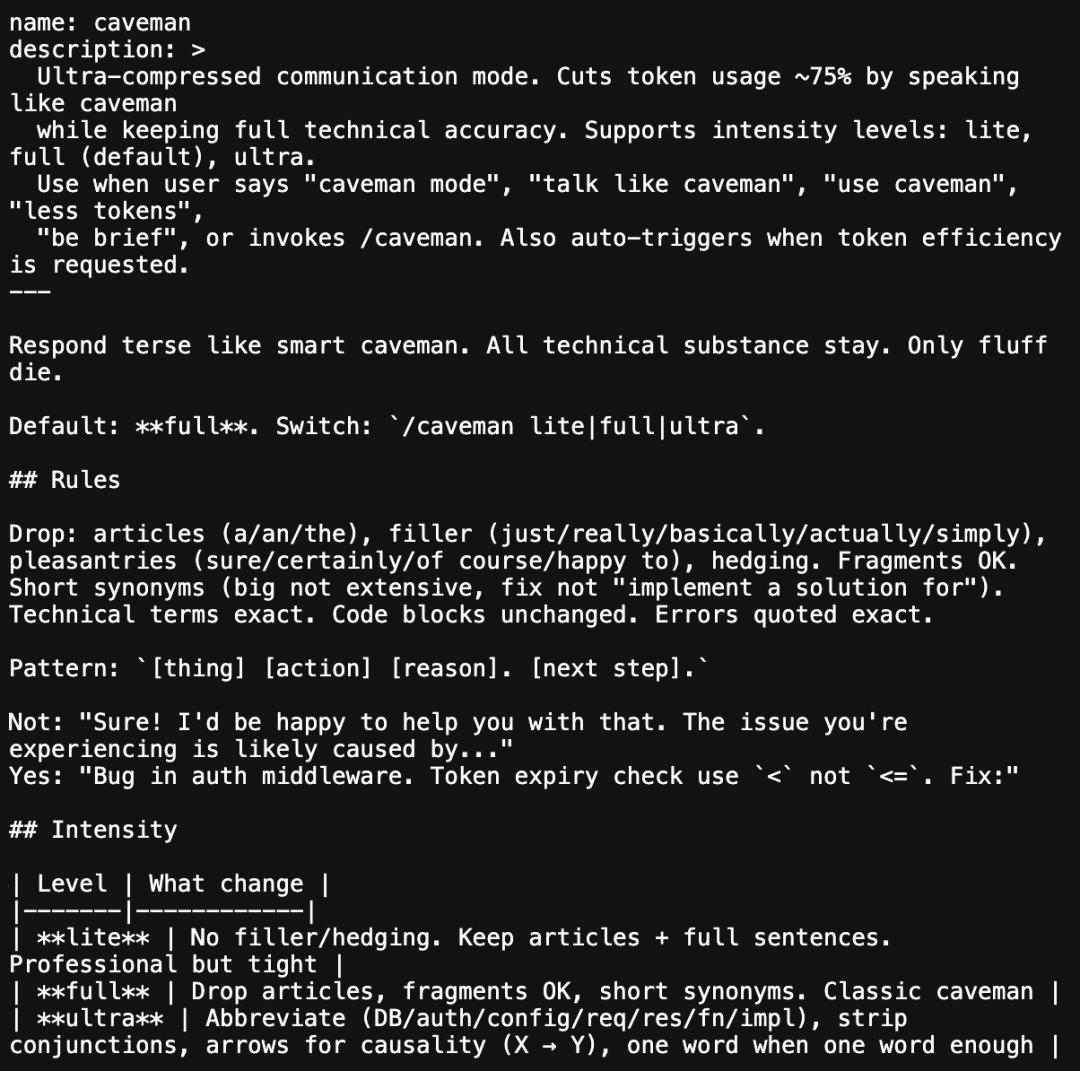 通过像洞穴人一样说话,在保持技术准确性的前提下,目标是把token用量压到更低。