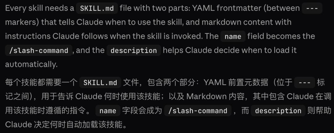 根据Anthropic官方文档,开发者只需创建一个SKILL.md文件,Claude就能把它识别为skill;其中description用来决定何时自动加载,name则会变成可直接触发的斜杠命令。