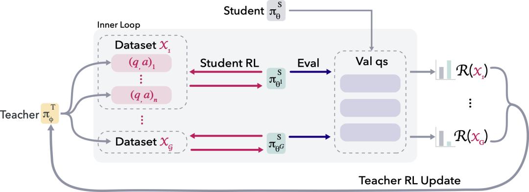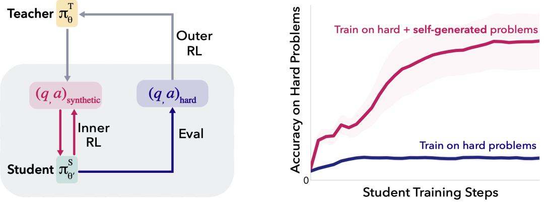 SOAR的meta-RL训练循环:教师模型生成合成数据集,学生模型在内层循环中进行强化学习训练,并在硬验证问题上评估进步,计算奖励R反馈给教师进行外层更新。奖励完全基于学生在极难题目上的真实提升,而非生成数据的正确性。