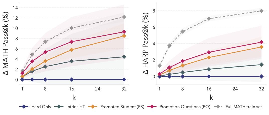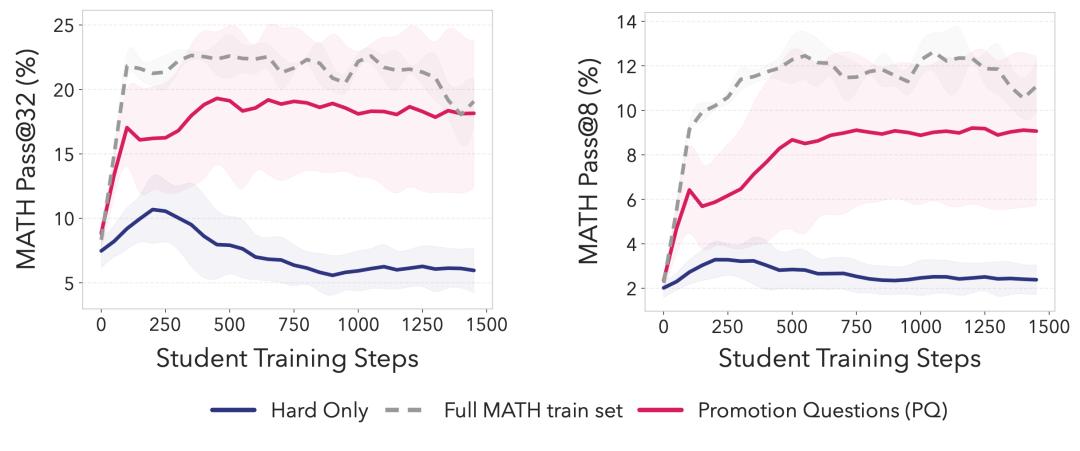 SOAR学习曲线:用Promotion Questions (粉线) 训练的学生模型,在1500步内Pass@32稳定升至~18-19%,接近完整MATH训练集的上界,而Hard Only (蓝线) 几乎无进步甚至衰退。这证明自我生成的合成数据能实现长期、稳定的推理提升