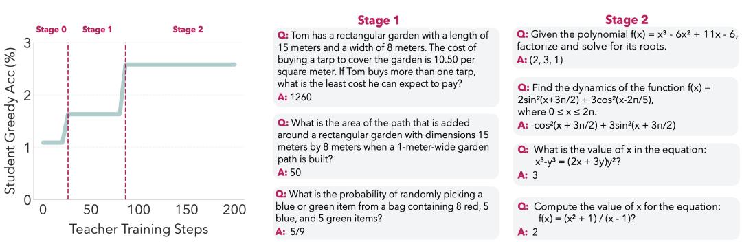 SOAR课程演化示例:左图显示学生在Fail@128硬题上的greedy acc随教师训练/promotion阶段阶梯上升;右图展示典型生成题目——Stage 1多为生活word problem,Stage 2转向高等代数/三角。这证明教师通过promotion逐步生成更难但结构有效的垫脚石,推动学生推理突破。