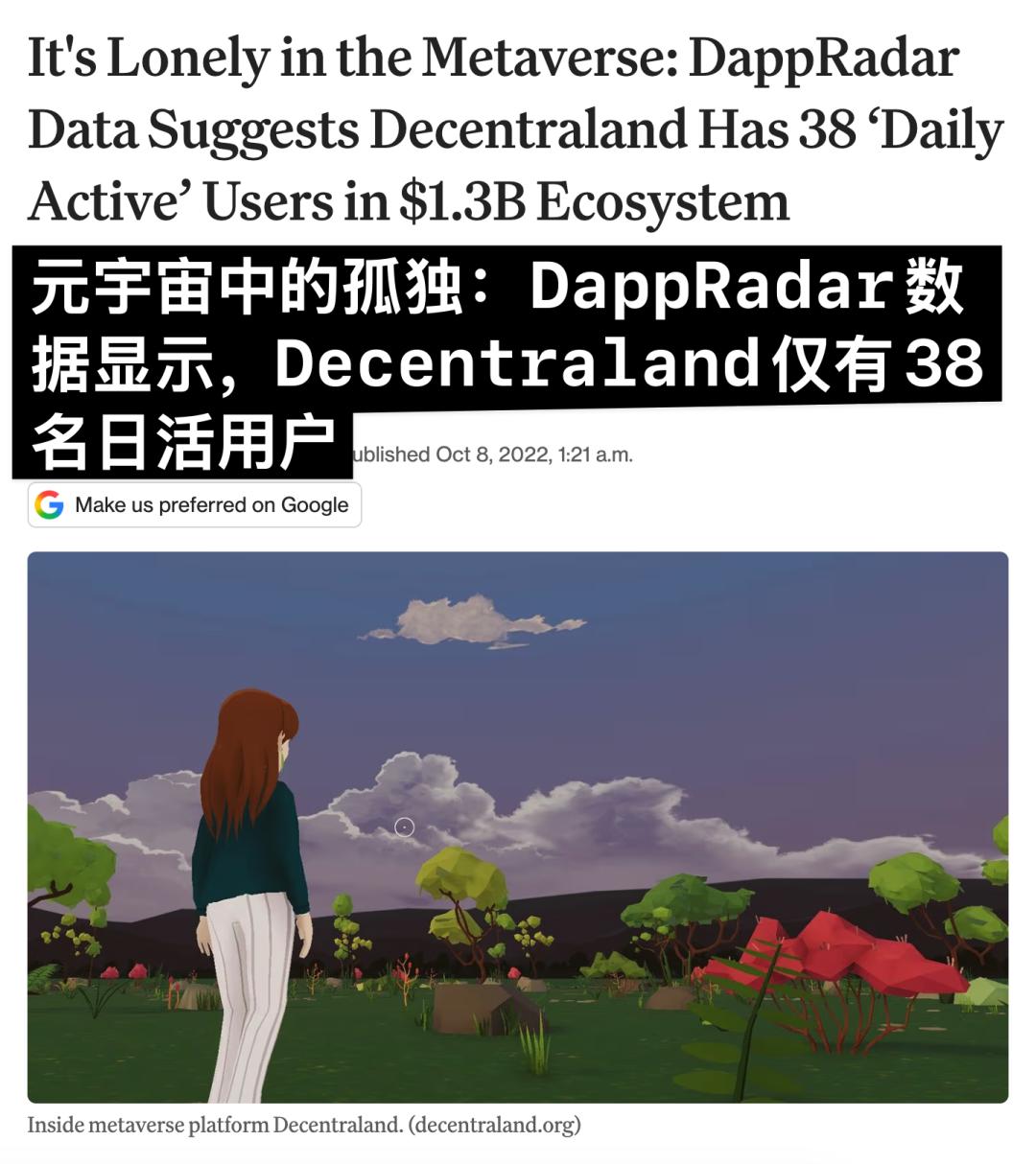 2022 年 10 月,DappRadar 的数据显示,Decentraland 的日活链上交互用户一度只有 38 个,The Sandbox 好一点,522 个。