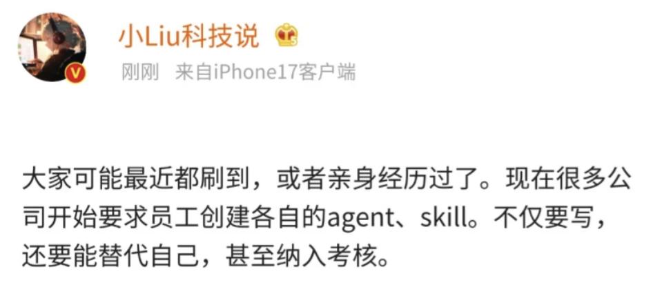 现在很多公司要求员工全员写自己的 Skill,美名其曰“知识沉淀”,其实是一场针对生产力的资产盘点。让员工将个人工作经验文档化,脱水处理成可以被 AI 理解并运行的说明书。