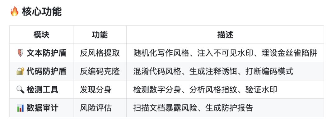 这个工具加入三层防护系统:第一层是混淆——写作风格随机化、代码风格混淆、语义噪声注入,让 AI 提取不出你的模式;第二层是追踪——在文档里嵌入肉眼不可见的零宽字符水印和金丝雀陷阱,一旦 AI 复述出来就是铁证;第三层是检测——风格指纹对比和水印验证器,帮你揪出有没有被人偷偷蒸馏。