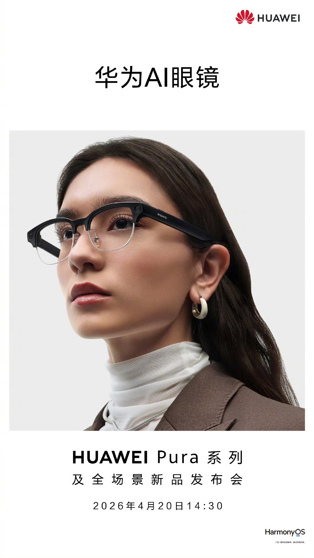 IT之家 4 月 13 日消息,今天下午,华为终端官微宣布:华为 AI 眼镜将于 4 月 20 日的华为 Pura 系列及全场景新品发布会上正式亮相,官方宣传语为“实力‘眼’技”。