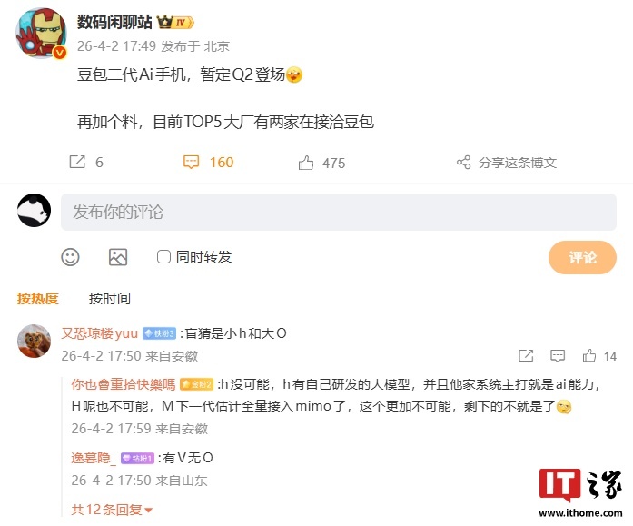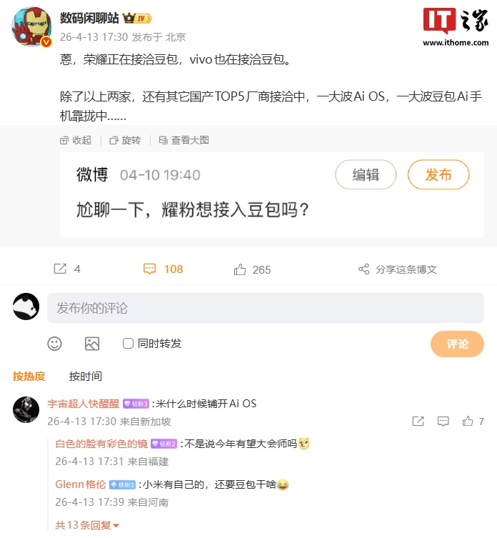 IT之家 4 月 13 日消息,博主 @数码闲聊站 今日发文透露,荣耀正在接洽豆包,vivo 也在接洽豆包。此外,还有其它国产 TOP5 厂商接洽中。博主表示,一大波 Ai OS 和一大波豆包 Ai 手机靠拢中。