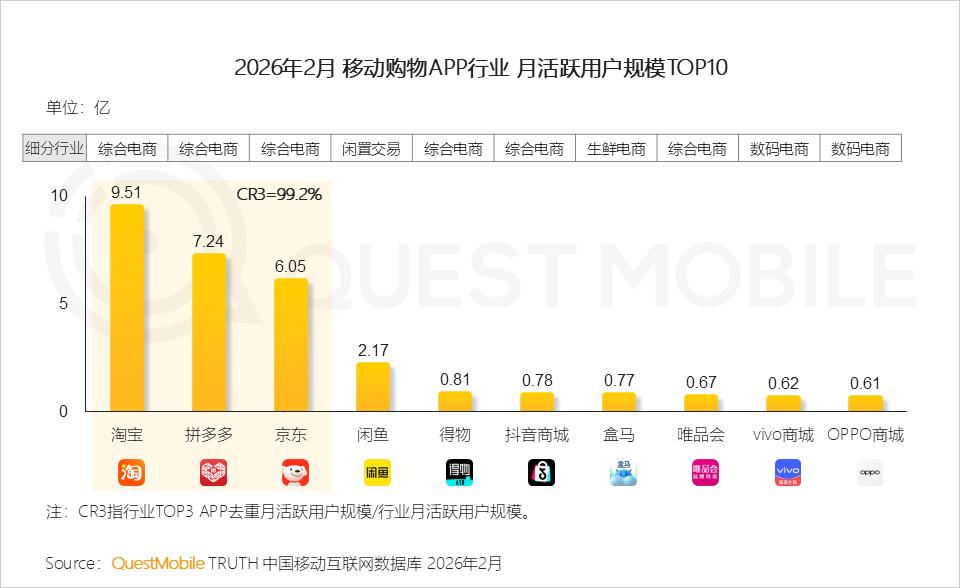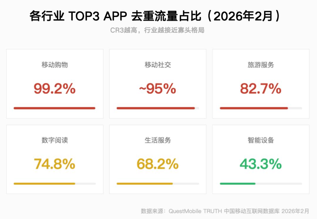 QuestMobile数据显示,2026年2月,中国移动互联网有一半行业,前三名应用的去重流量占该行业总流量超过八成。移动购物CR3(行业TOP3 APP去重月活跃用户规模/行业月活跃用户规模)已达99.2%,旅游服务82.7%。