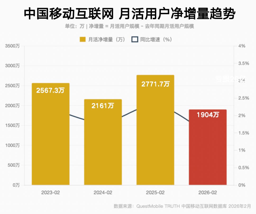 Questmobile数据显示,2026年2月,中国移动互联网月活用户净增量为1904万,同比增速仅1.5%。这是过去一年半里,第三次跌破2000万。