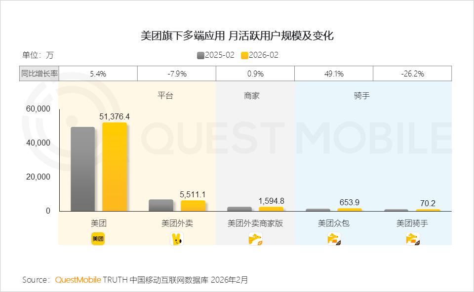 2026年2月,美团APP月活5.14亿,同比涨5.4%。但美团外卖APP月活5511万,同比跌了7.9%。