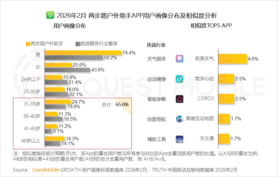 两步路同理,主力用户是31-35岁的男性专业户外人群,同时用莉景天气、COROS运动手表APP、数字心动。这是个小而深的生态,头部平台进来性价比不高,但垂类平台守住了,用户的粘性和付费意愿会相当强。