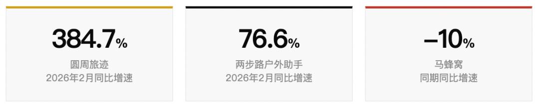 旅游服务CR3已经到了82.7%,但圆周旅迹这款攻略型应用,2026年2月同比增速384.7%。两步路户外助手增速76.6%。