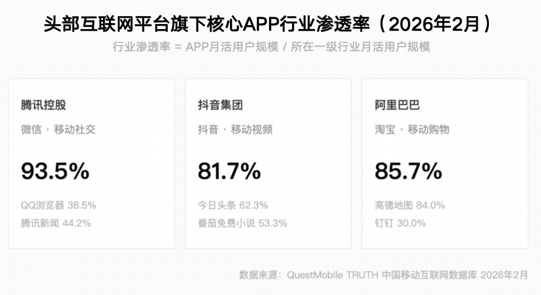 三家都是用一个超高渗透率的核心产品锚定用户,再把其他产品嫁接进来。微信93.5%的渗透率,意味着它几乎等于移动社交本身;淘宝85.7%在电商里同理;抖音81.7%在短视频亦如此。