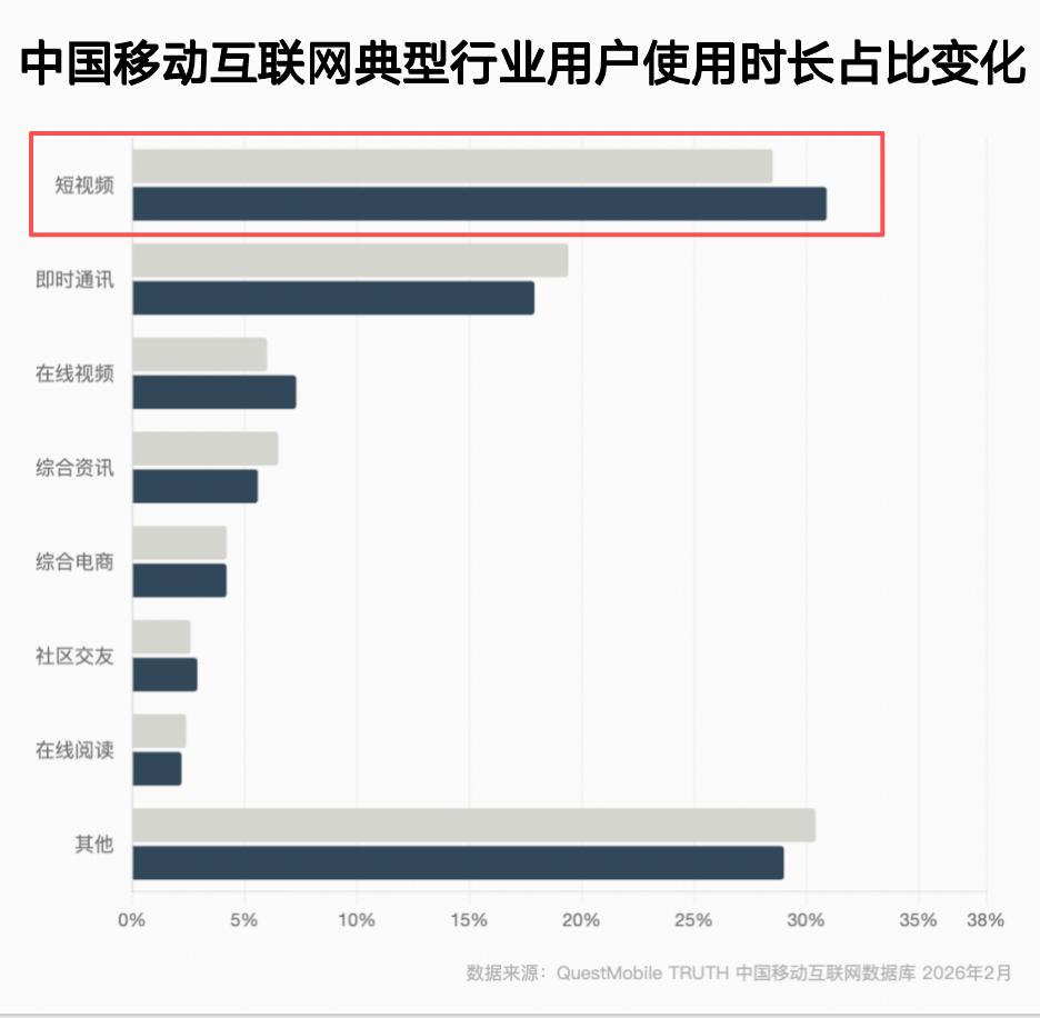 2026年2月,短视频拿走全网用户使用时长的30.9%,同比涨了1.3个点。在线视频7.3%,涨0.7个点。两项加起来快逼近四成,也就是说,用户每在手机上花10分钟,将近4分钟进了视频的口袋,而且还在涨。