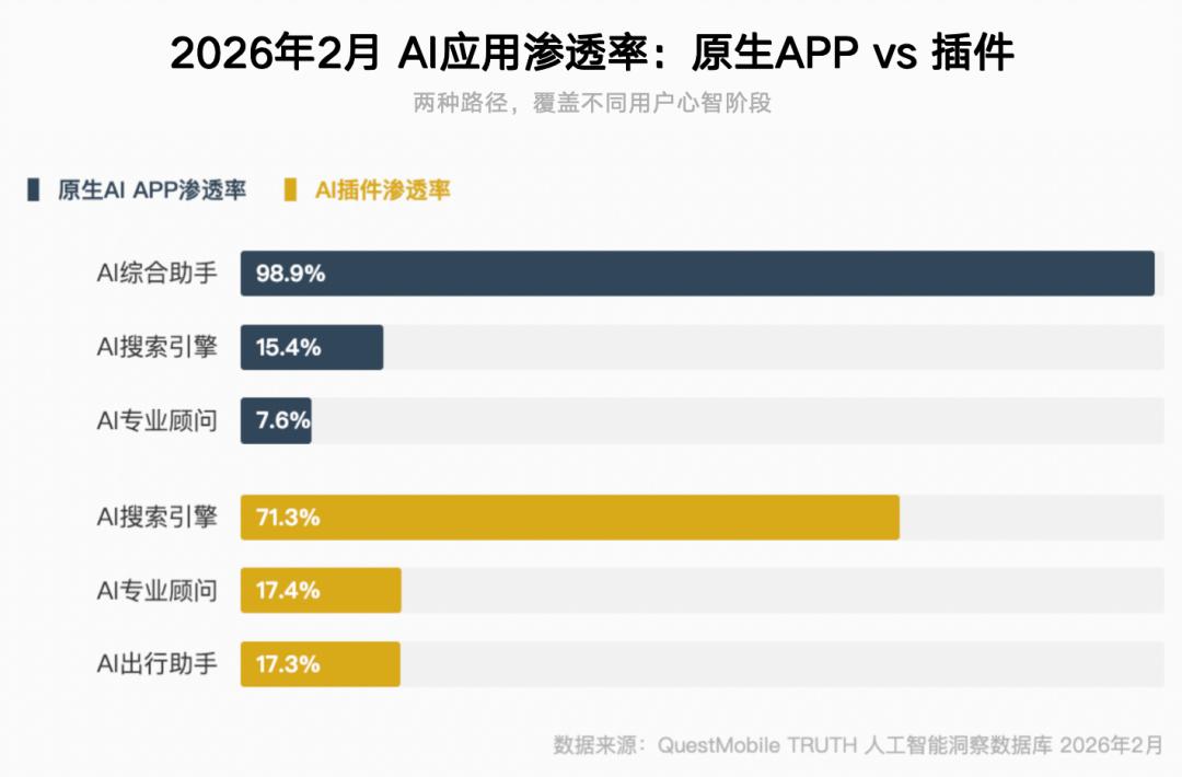 真正渗透大众的,是插件嵌入。搜索引擎类AI插件渗透率71.3%,覆盖的是十几亿量级的存量用户。微博的AI智搜、爱奇艺的桃豆、招商银行的小招,这类产品不要求用户改变任何习惯,直接在原有场景里塞进AI能力,用户几乎没有感知门槛。这才是AI渗大众的主战场,只是没有独立App那么好讲故事。