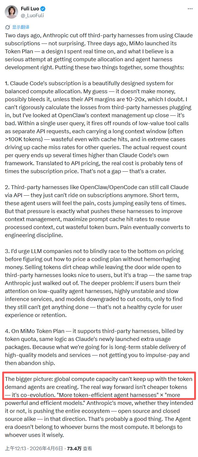 Token 经济的新竞争,已经细微到“谁能让每一个 Token 产出更高的价值”。罗福莉在自己那篇浏览量超过73w+的帖子最后写道,真正的出路不是更便宜的 Token,而是模型和 Agent 的协同进化。