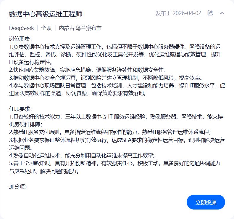 近日,AI大模型公司DeepSeek发布全新招聘岗位,此次招聘岗位为数据中心高级运维工程师、数据中心高级交付经理,月薪最高可达30000元。