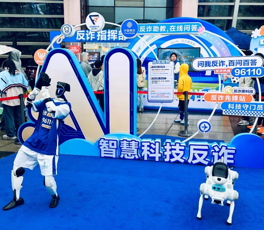 在常州奥体中心的入场通道内,一场科技感十足的反诈宣传活动吸引了众多球迷驻足。灵动的机器狗在人群中穿梭,时而翻滚、时而作揖,引得孩子们争相模仿,家长们纷纷举起手机拍照。一旁的反诈智能机器人则成了“主考官”,随机从海量反诈题库中抽题“拷问”球迷,不仅能实时识别语音答案、判断对错,还会为答对的球迷献上一舞。