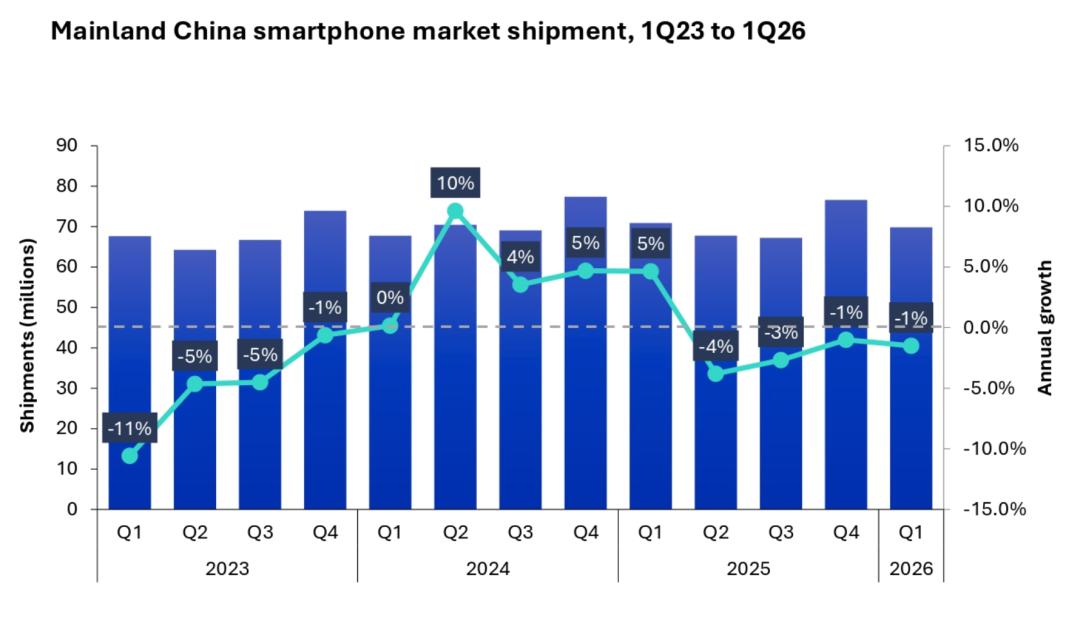Omdia最新研究显示,2026年Q1,中国大陆手机市场出货量6980万台,同比下滑1%。这个数字本身不算难看,更残酷的市场厮杀在后面,Omdia预测,2026年全年中国大陆智能手机市场出货量将下滑约10%。
