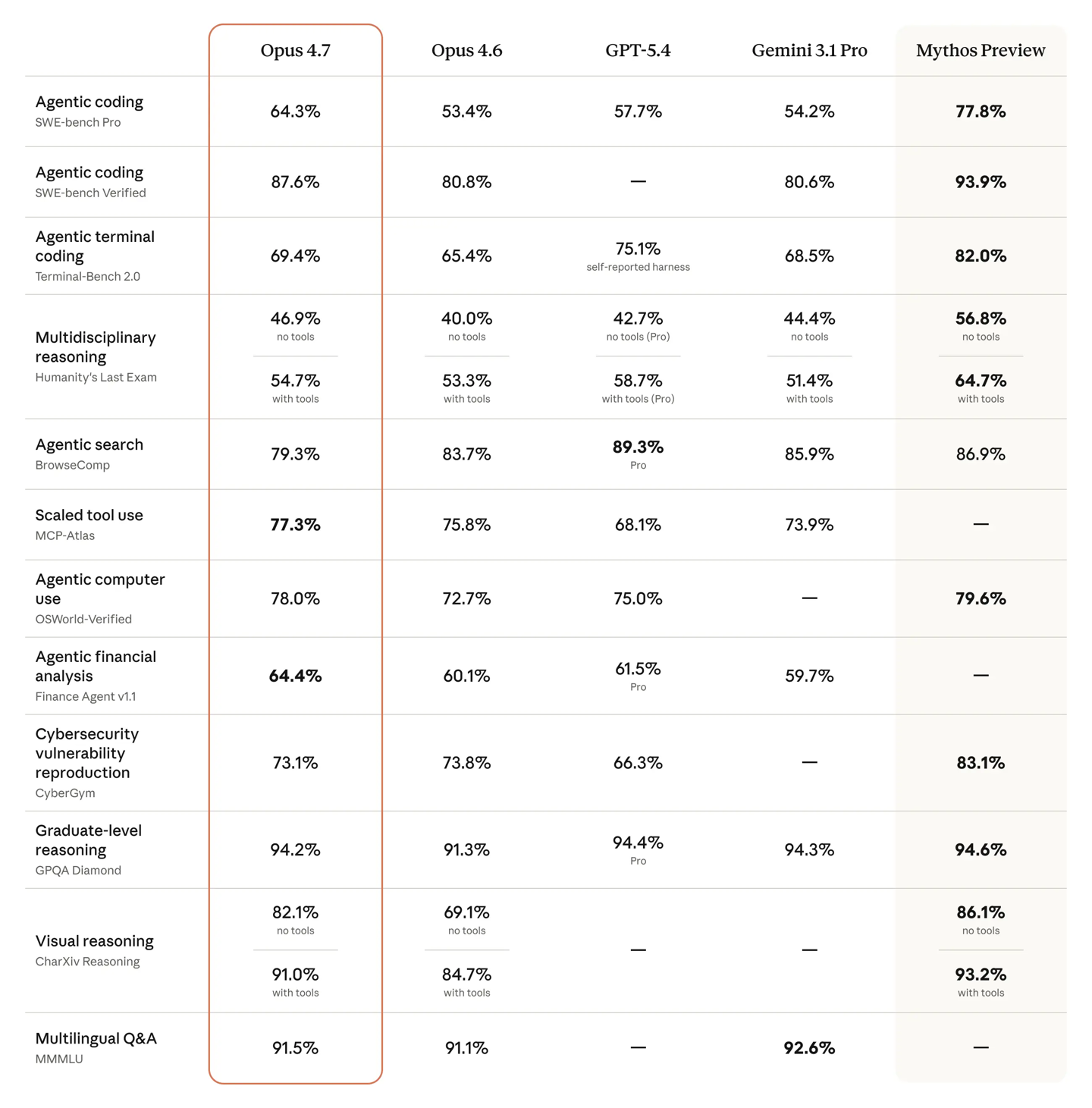 在智能体编码、计算机操作等多项应用场景的基准测试中,Opus 4.7 表现亮眼,性能超越了 Opus 4.6、GPT-5.4 以及 Gemini 3.1 Pro,但略逊于能力更全面的 Claude Mythos Preview。不过 Mythos 并未像 Opus 4.7 这样全面开放使用,目前 Anthropic 仅向苹果等核心软件平台厂商提供该版本。