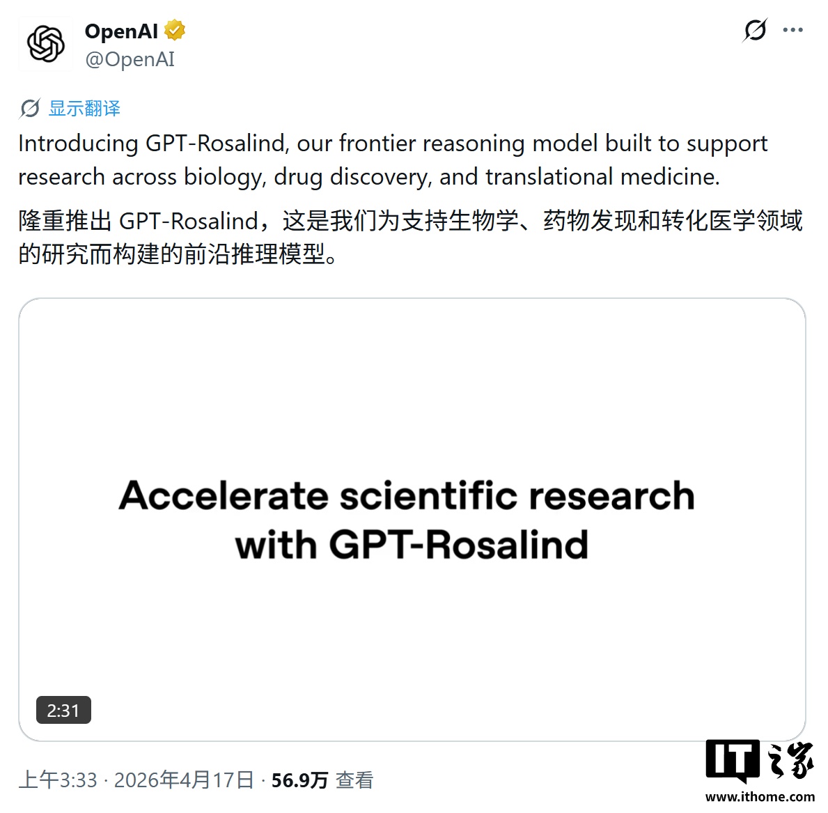 IT之家 4 月 17 日消息,OpenAI 周四宣布推出 GPT-Rosalind,这是一款专为生物学工作流训练的大语言模型。与谷歌、微软等科技巨头推出的通用科学模型不同,GPT-Rosalind 走垂直路线,专注于生物学领域。