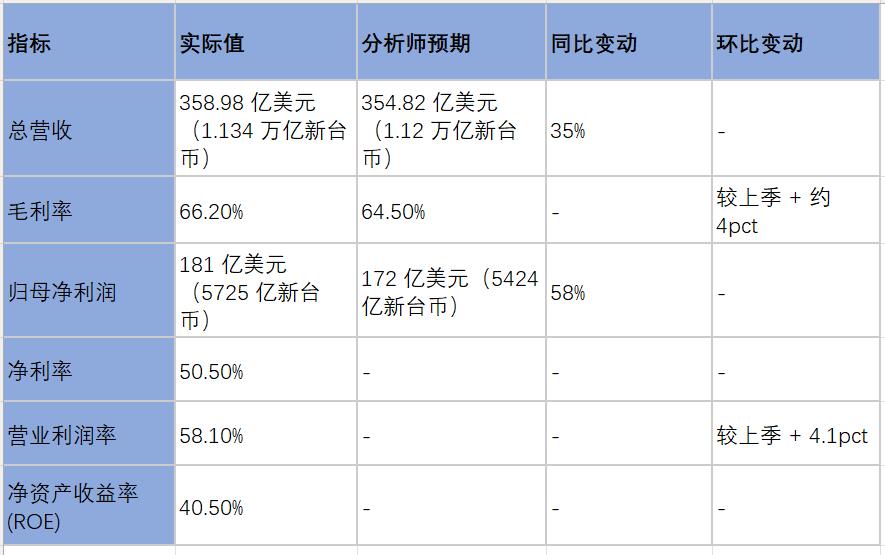 美东时间4月16日,台积电公布了2026年第一季度的财务报告,录得总营收358.98亿美元(1.134万亿新台币),高于分析师预期的354.82亿美元(1.12万亿新台币),毛利率达到了66.2%,大幅高于预估的64.5%,归母净利润录得181亿美元(5,725亿新台币),同样明显高于分析师预测的172亿美元(5,424亿新台币)。