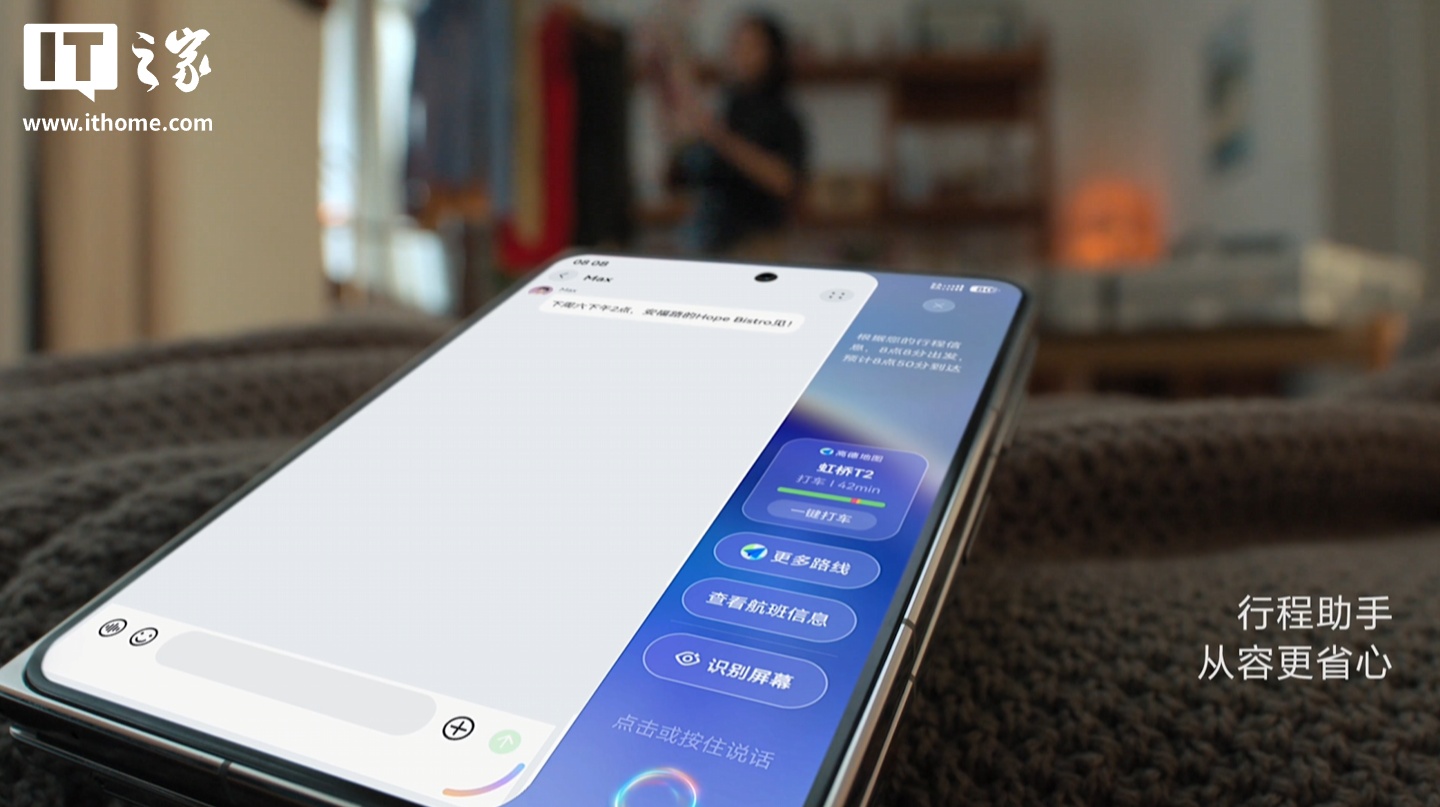 • 行程助手:可智能识别当前 App 显示的信息,提供路线规划、预计行程所需时间、查询航班信息、一键打车等功能;