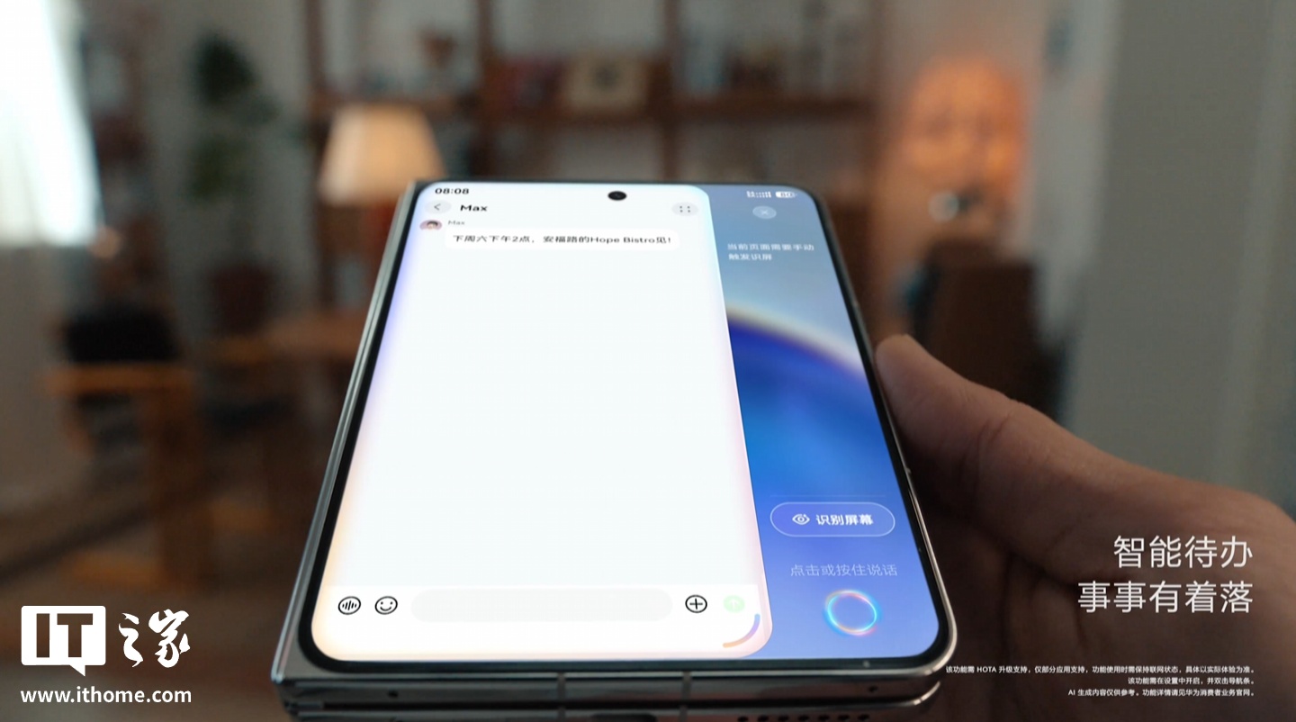 全新小艺伴随式 AI 预计属于鸿蒙 HarmonyOS 6.1 版本的功能。根据官方预热视频的注释来看,该功能目前已适配部分应用,但需后续 HOTA 支持,并保持联网状态方可使用。另外,使用全新小艺伴随式 AI 前需要先在设置中开启,后续可通过双击导航条(屏幕底部小白条)唤起。